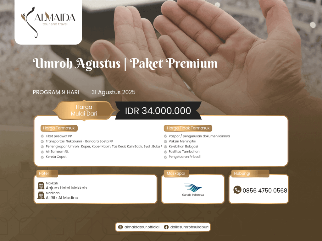 - Perlengkapan Umroh : Koper, Koper Kabin, Tas Kecil, Kain Batik, Syal , Buku Panduan Umroh, Tas Sandal, Kain Ihrom (Laki-laki), Sabuk (Laki-laki), Mukena (Perempuan), Kerudung (Perempuan)